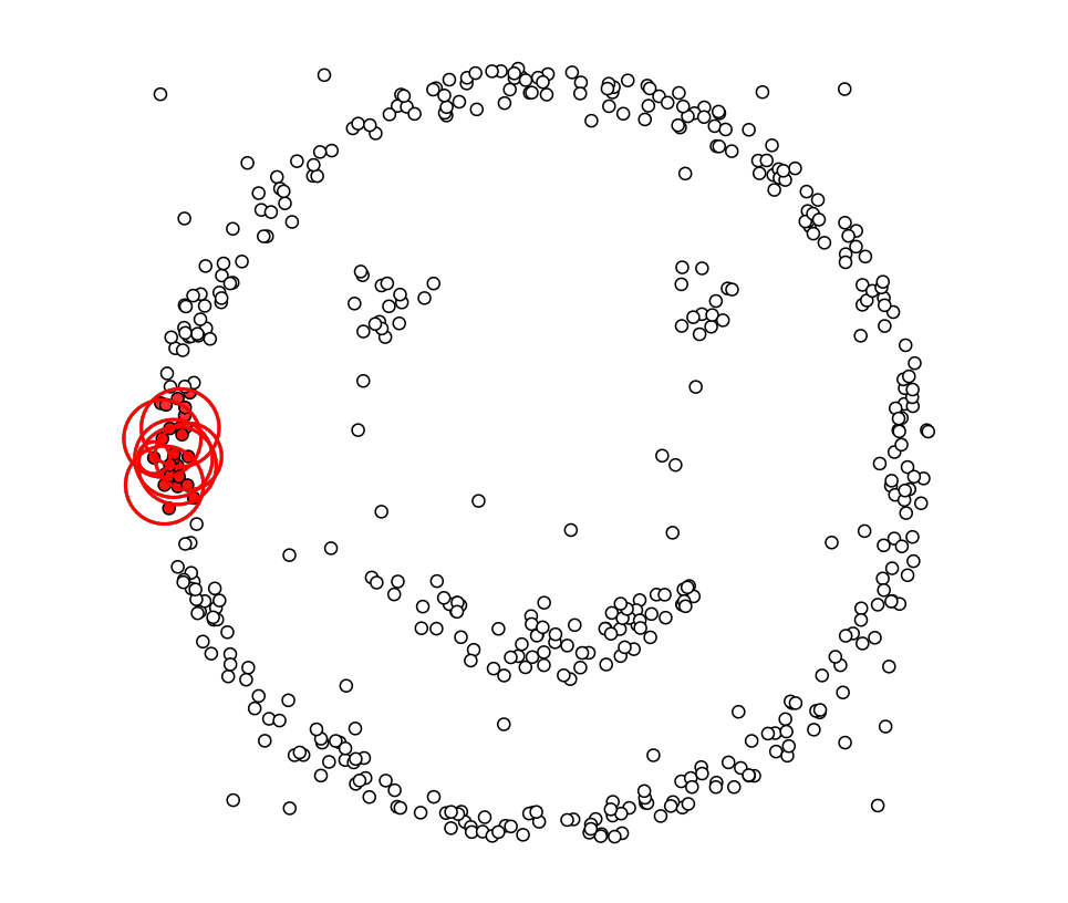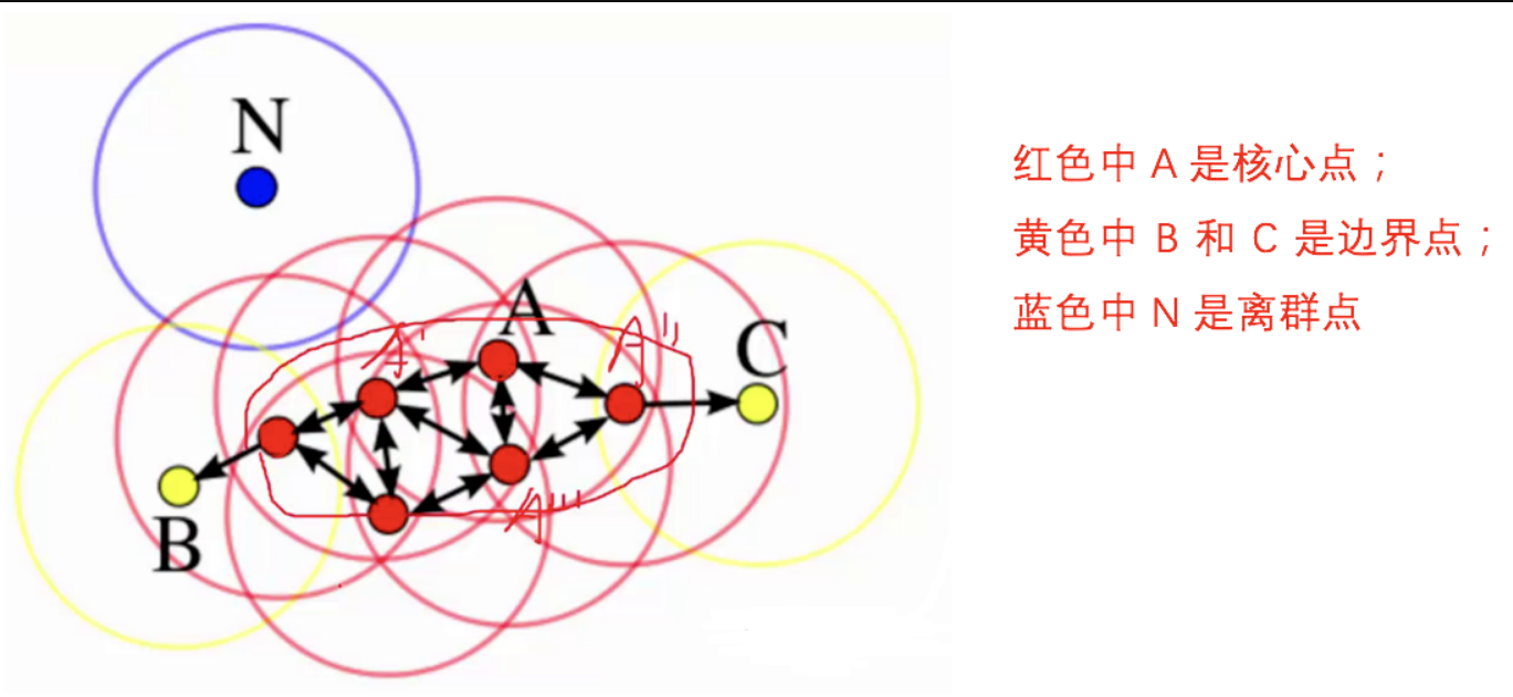 下面这些点是分布在样本空间的众多样本,现在我们的目标是把这些在样本空间中距离相近的聚成一类。我们发现A点附近的点密度较大,红色的圆圈根据一定的规则在这里滚啊滚,最终收纳了A附近的5个点,标记为红色也就是定为同一个簇。其它没有被收纳的根据一样的规则成簇。(形象来说,我们可以认为这是系统在众多样本点中随机选中一个,围绕这个被选中的样本点画一个圆,规定这个圆的半径以及圆内最少包含的样本点,如果在指定半径内有足够多的样本点在内,那么这个圆圈的圆心就转移到这个内部样本点,继续去圈附近其它的样本点,类似传销一样,继续去发展下线。等到这个滚来滚去的圈发现所圈住的样本点数量少于预先指定的值,就停止了。那么我们称最开始那个点为核心点,如A,停下来的那个点为边界点,如B、C,没得滚的那个点为离群点,如N)。
