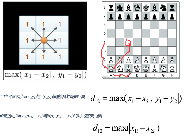 P = 无穷,切比雪夫距离 ,哪个维度差值最大就是那个差值作为距离。